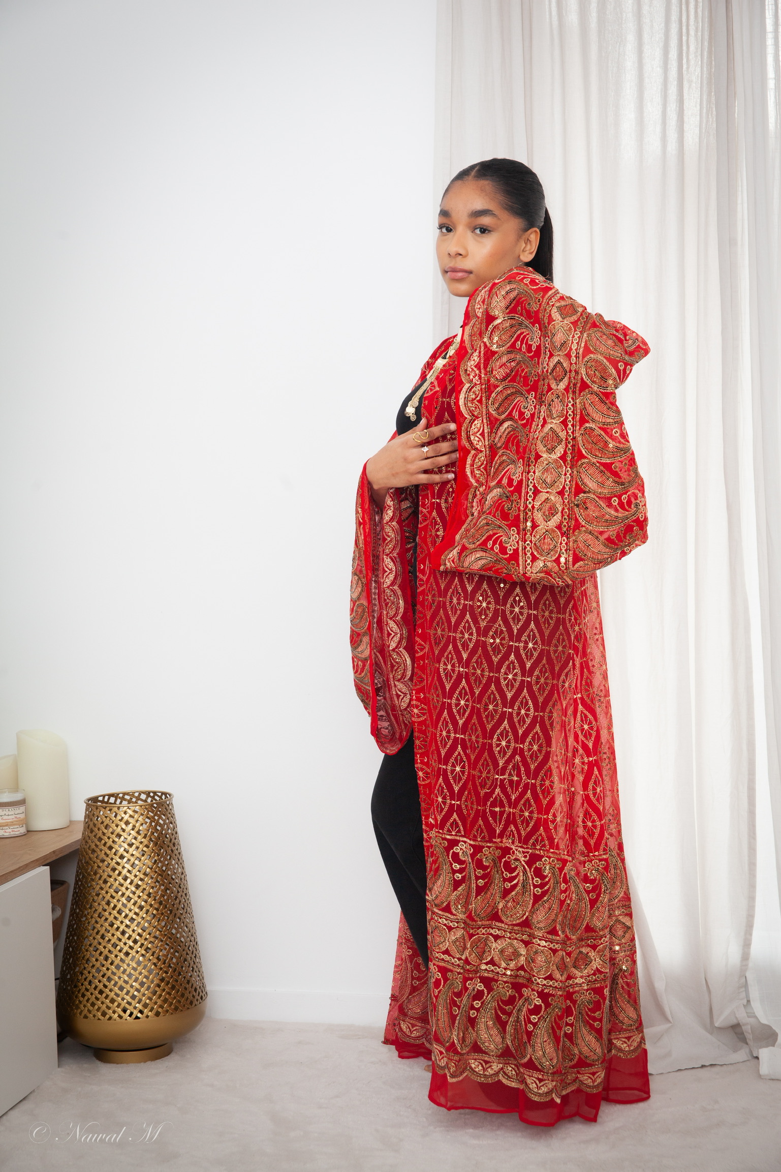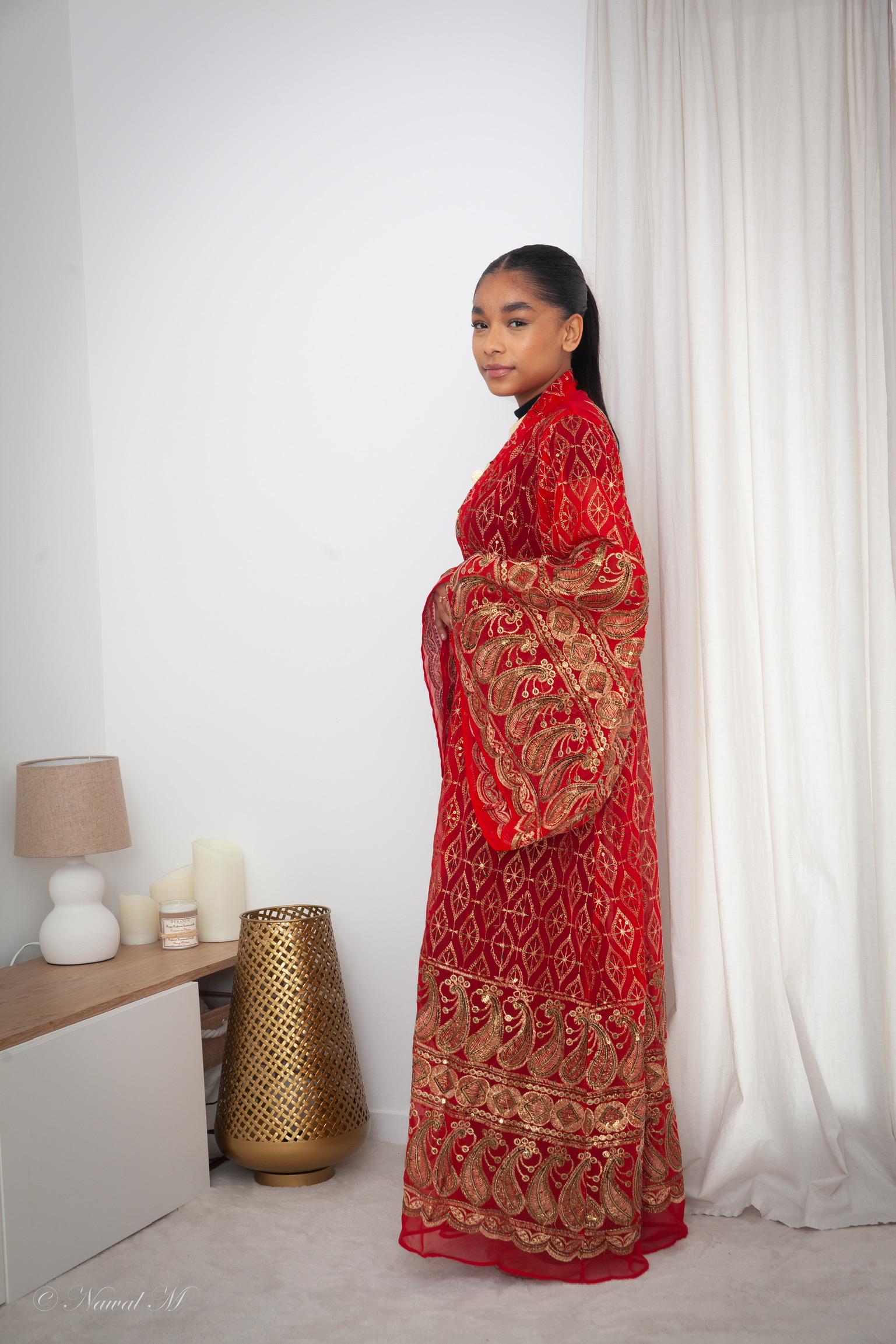 Parce que le rouge symbolise la force, l’énergie , la passion et évidemment l’amour , nous vous avons conçu avec minutie une Thamani pleine de beauté par son tissu éclatant avec des manches kimonos qui vous rendront singulièrement ravissante . Quand l’Asie rencontre l’Inde 🇮🇳….